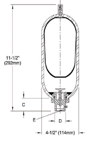 Utilizes an upper cap and threaded ring assembly to retain and seal the open-topped bladder, providing a simple “top-repairable” advantage; e.g., unit does not have to be removed from a vertically mounted application in order to replace bladder as long as the accumulator can be isolated from system pressure and physically accessible.